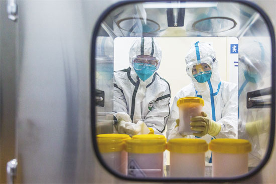 2月25日,中国疾病预防控制中心传染病预防控制所P3实验室,工作人员在传递窗口接收刚刚从浙江省疾控中心运抵的疫苗生产用新型冠状病毒毒株。图片来源 新华社
