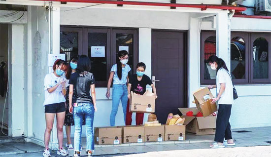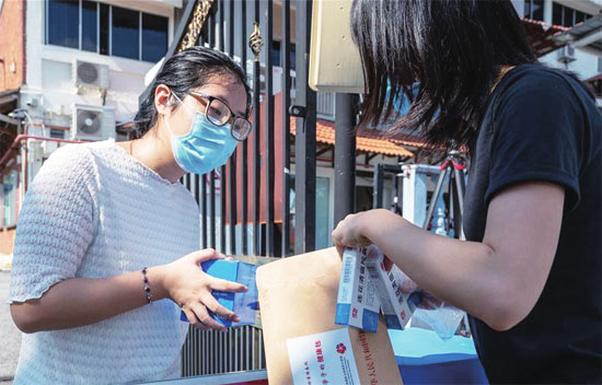 在马来亚大学国际学生宿舍,中国留学生志愿者分发“健康包”。 图片来源 新华社