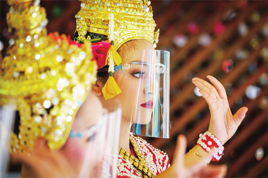 佩戴防护面罩的舞者在泰国曼谷表演。鉴于泰国单日新增病例数已得到控制,该国政府允许开在商场外的餐馆、路边小吃摊、公园、杂货店、美容院等从5月3日起开放。
