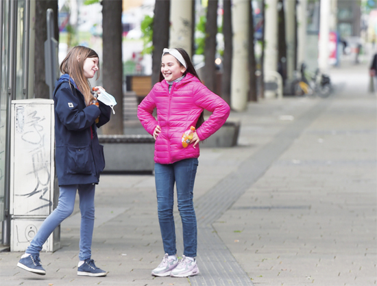 5月1日,两名小女孩在奥地利首都维也纳玛利亚希尔夫大街上。从5月1日起,该国进一步解除应对新冠疫情的限制措施,允许最多10人聚集,逐步复工复课。