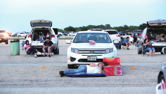 5月1日,在美国得克萨斯州新布朗费尔斯,人们在汽车电影院等候电影开场。得州自5月1日起分阶段复工,第一阶段开放的包括零售商店、电影院、餐馆、运动场所等,但有一定的限制条件。