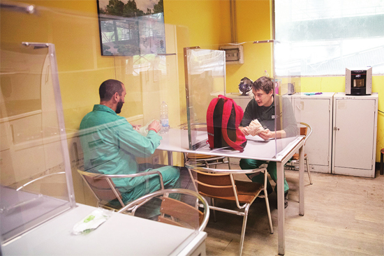 5月2日,意大利特尔尼一家不锈钢工厂的工人在装有塑料隔板的房间内休息。