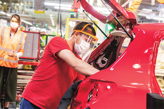 4月28日,丰田汽车公司的工人在位于法国瓦朗西安纳的车间里工作。丰田在当地的生产线于4月23日开始逐渐复工。