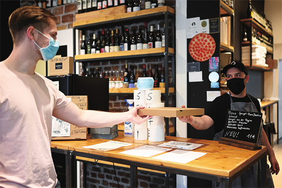 4月28日,在德国杜塞尔多夫,快餐店员工将披萨递给顾客。德国放松了限制措施,允许部分餐馆提供外卖服务,但不能堂食。