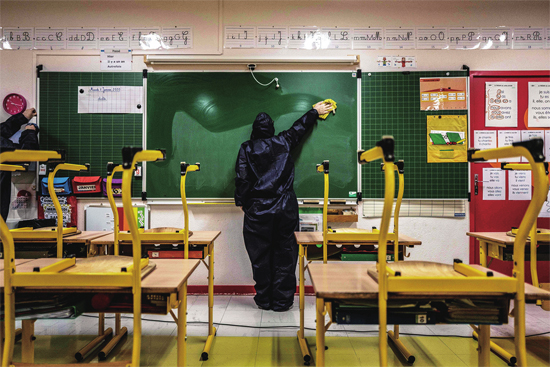 5月6日,在法国博讷的一所公立学校,工作人员对教室进行清扫和消毒。自5月11日起,法国的幼儿园和小学逐步开放。在疫情不严重的省份,初中从5月18日起逐步开学。图片来源 新华社