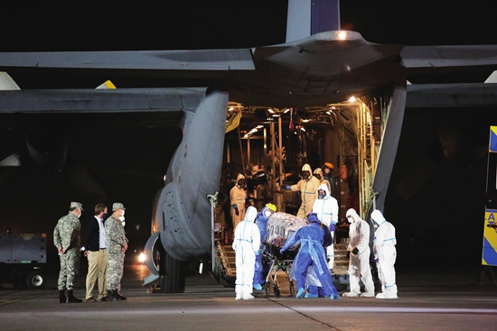 5月14日,为减轻首都圣地亚哥的医疗系统压力,智利卫生部首次联合空军,使用军用飞机将部分新冠肺炎重症病人运至其他地区治疗。图片来源 新华社