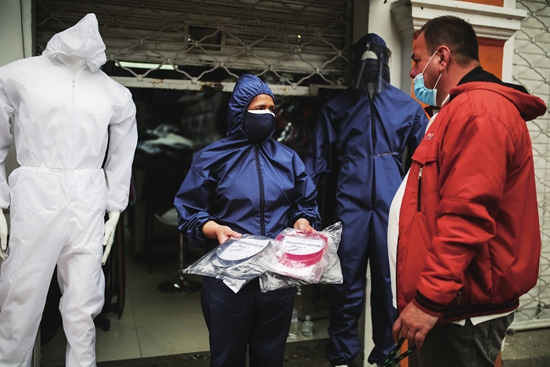 5月12日,哥伦比亚首都波哥大,一名商贩售卖防疫用品。图片来源 新华社
