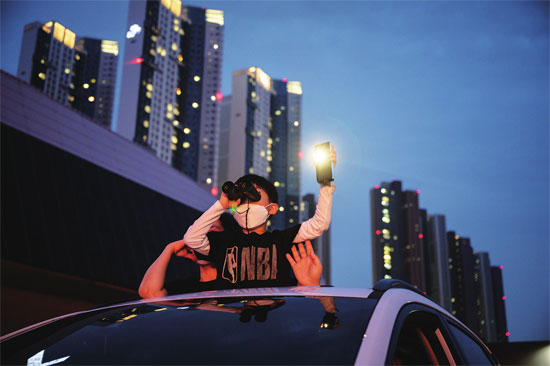5月23日,在韩国高阳市举行的一场露天汽车音乐会上,一名儿童从汽车天窗探出头来观看音乐会。图片来源 新华社