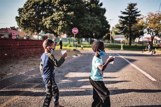 5月23日,在南非约翰内斯堡郊区,两名儿童领取了慈善组织分发的粥。南非总统拉马福萨5月24日晚发表电视讲话说,南非将从6月1日起进一步放松“封城”措施,“封城”等级将从当前的四级降至三级。图片来源 新华社