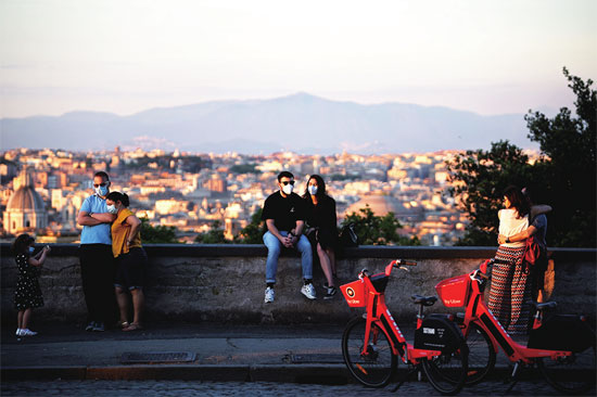 5月23日,人们在意大利罗马贾尼科洛山上的观景平台欣赏夕阳。从5月18日起,意大利大幅放松疫情管控措施,商店、餐厅、理发店、博物馆等场所重新开放,但商家和顾客必须遵守安全距离和消毒等方面的规定。图片来源 新华社