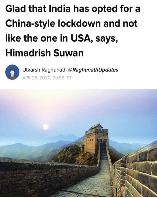 《印度时报》报道称,印度青年领袖联合会主席苏万“很高兴印度选择了中国式而非美国式的隔离政策”。图片来源 印度青年领袖联合会