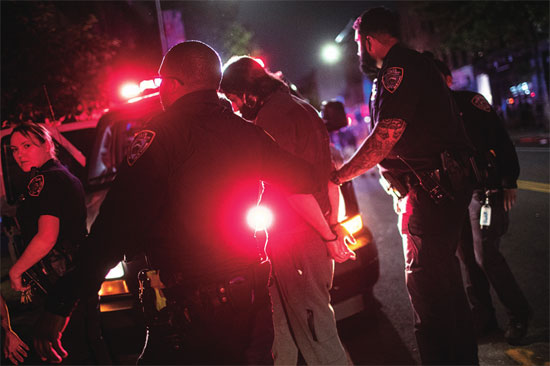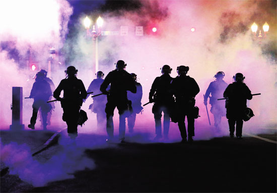 5月29日,美国波特兰市,警察在催泪弹烟雾中前行。本版图片来源 新华社