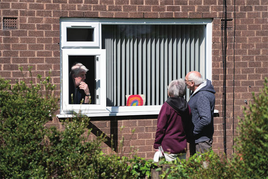 英国曼彻斯特居民隔着窗户交谈。根据此前的英国防疫政策,来自不同家庭的人在室内见面是违法的。图片来源 新华社