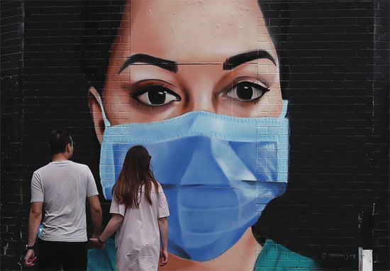在英国伦敦,一对情侣从疫情主题的壁画前走过。图片来源 新华社