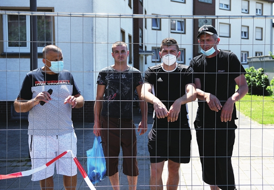 肉联厂工人大多住在居特斯洛附近。从苏赞接受采访的餐厅出发走上几分钟,就能见到一栋工人宿舍。两个男人坐在3楼阳台上,抽着烟眺望远方。这些来自北马其顿的人告诉《费加罗报》,这栋楼被隔离了,从6月19日开始,再没有人给他们送过食物。他们无法给家乡的人打电话,也不能离开这栋楼,房间里没通互联网。