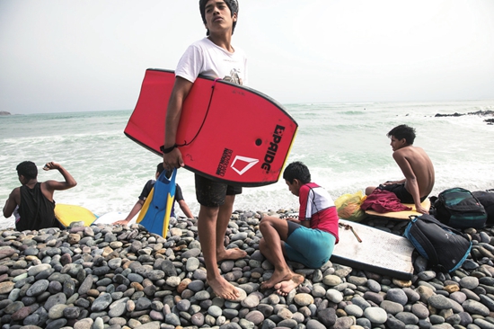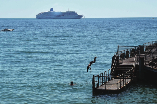 6月25日,西班牙巴塞罗那,酷暑之下,人们入海冲浪。
