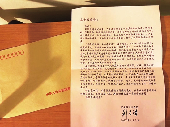 中国驻波兰大使刘光源写给波兰中国留学生的慰问信。作者供图