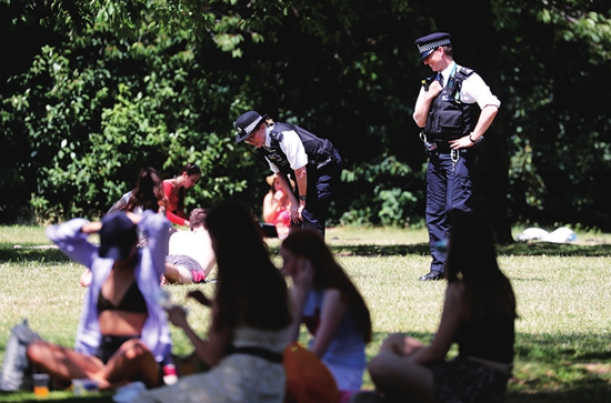 6月23日,警察在英国伦敦一座公园里与晒日光浴者交谈。图片来源 新华社