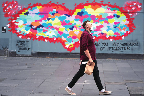 7月1日,一名男子走在英国莱斯特街头。由于新冠肺炎确诊病例猛增,莱斯特于6月底收紧了疫情防控措施。图片来源 新华社