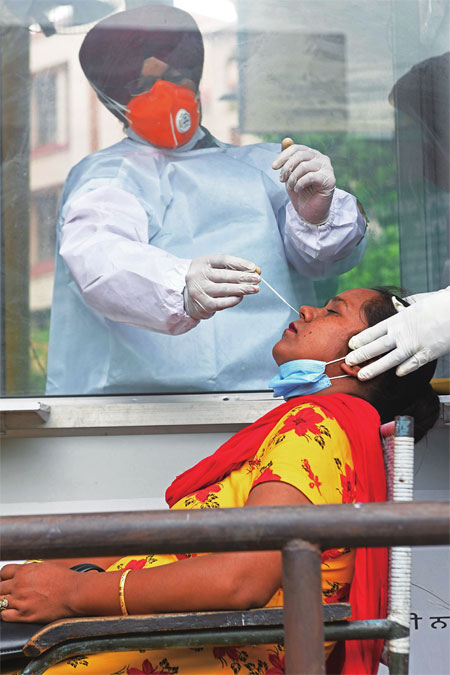 7月17日,医务人员在印度阿姆利则进行新冠病毒检测取样。印度是第三个累计确诊病例数突破100万的国家,该国专家预测,按照当前趋势发展,未来一个月内印度确诊病例将突破200万例。 图片来源 新华社