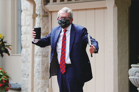 8月6日,美国俄亥俄州州长迈克·德瓦恩向媒体记者致意。当天,就在迎接特朗普总统之前,德瓦恩的新冠病毒检测结果呈阳性。图片来源 新华社