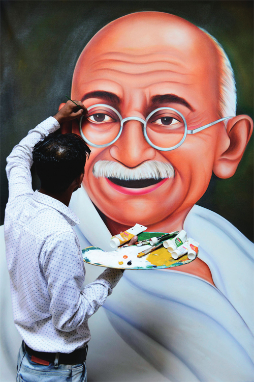 2019年10月1日,印度阿姆利则,一名男子创作“国父”甘地的画像。图片来源 新华社