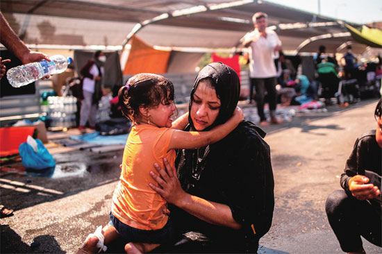 9月12日,希腊莱斯沃斯,一名难民母亲抱着孩子等待领水。