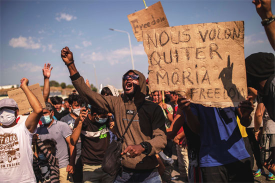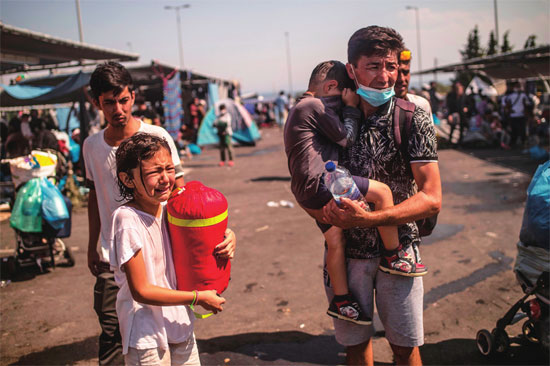 9月11日,莫里亚难民营毁于火灾后,大量难民露宿街头。