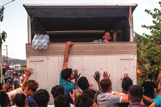 9月12日,希腊莱斯沃斯,难民围住一辆分发物资的卡车,等待取水。