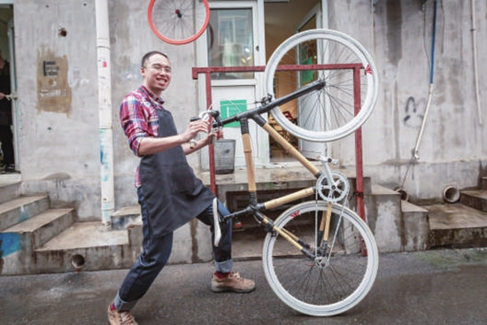 2017年8月,北京郞家胡同,一名创业者展示其工作室出品的“竹子自行车”。