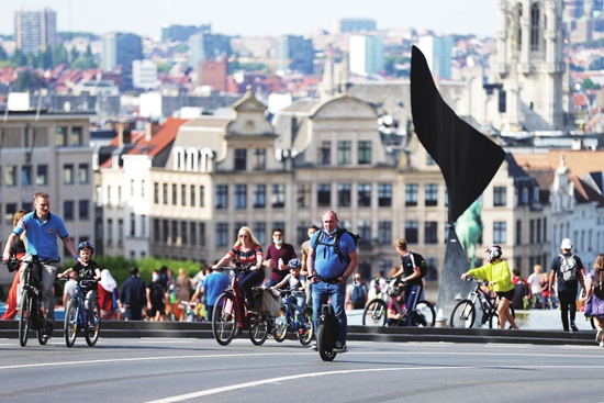 9月20日,人们在比利时布鲁塞尔使用绿色交通工具出行。当日,布鲁塞尔举行一年一度的无车日活动,从9时30分至19时,市区内除公交车、出租车和部分特种车辆外,其他机动车禁止上路,市内公共交通免费。