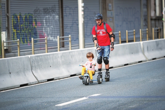 9月20日,比利时布鲁塞尔举办无车日活动,一名带孩子的男子在公路上滑轮滑。