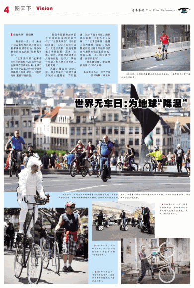 每年的9月22日,来自不同国家和地区的环保主义者聚集在城市街头,用各种新奇的方式庆祝“世界无车日”。