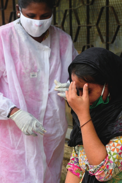 10月12日,医护人员在印度孟买为居民进行新冠病毒检测取样。截至当天,该国累计确诊病例数已突破705万例。图片来源 新华社