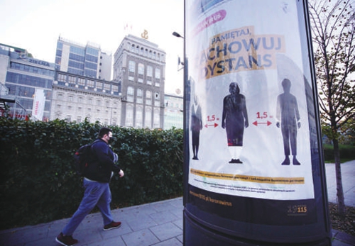 10月8日,波兰首都华沙,市民戴口罩出行。自新冠肺炎疫情在该国蔓延以来,感染人数不断增加。波兰从10月10日开始升级为“黄色区域”,人们在户外必须戴口罩。图片来源 视觉中国