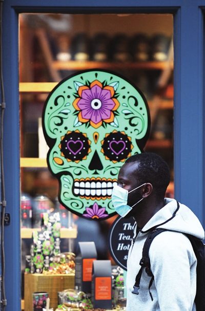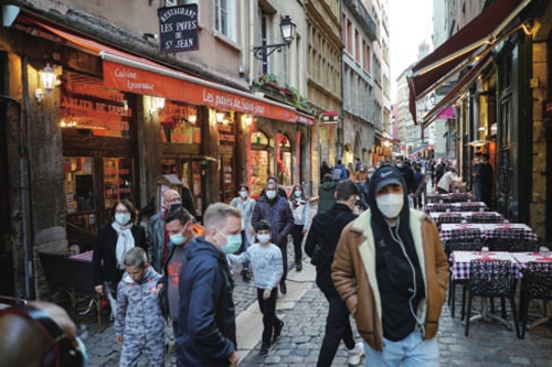 10月10日,人们戴着口罩走在法国里昂街头。法国公共卫生部门10日公布的数据显示,该国单日新增病例数再创新高,累计确诊病例超过70万例。图片来源 新华社