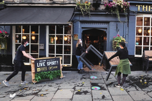 10月9日,在英国苏格兰爱丁堡一家酒吧门口,工作人员收拾桌椅准备打烊。根据苏格兰政府首席大臣妮古拉·斯特金7日宣布的新防疫措施,从9日起,苏格兰中部地区的酒吧和餐馆必须在每晚6点前结束营业。新措施将持续执行至25日。图片来源 新华社