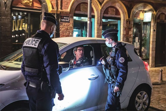 10月17日晚,法国北部城市里尔,警察盘查宵禁后出行的市民。