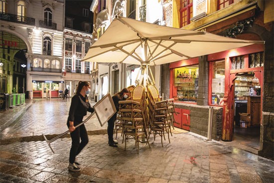 10月17日晚,法国北部城市里尔,店员赶在宵禁开始前收拾店铺。