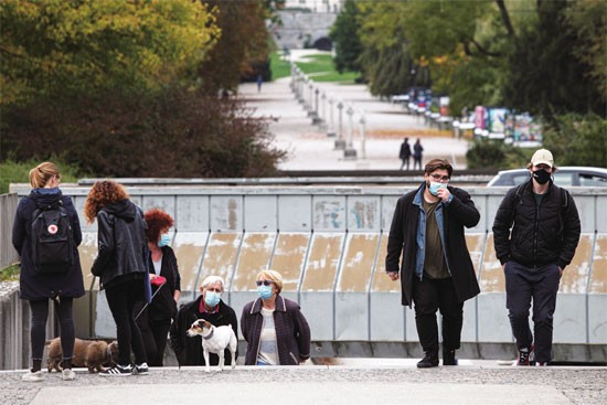 10月19日,斯洛文尼亚首都卢布尔雅那,人们戴口罩出行。斯洛文尼亚政府19日宣布将加强防控措施应对疫情反弹,包括实施宵禁。