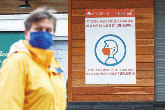 10月17日,比利时布鲁塞尔,行人经过一处关于佩戴口罩的提示。