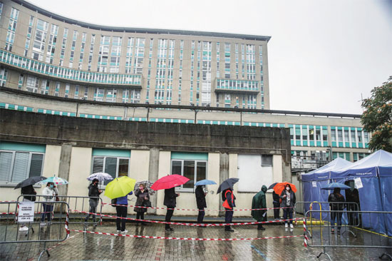 10月15日,在意大利米兰,人们排队等待接受新冠病毒检测。近日,意大利政府再度收紧防疫措施,并将国家紧急状态延续至2021年1月31日。此外,意大利扩大了在意边境进行预防性筛查的欧洲国家数量,同时增派日常巡逻警力,以更好地监督人们遵守最新防控措施。图片来源 新华社