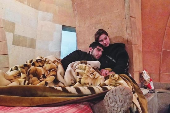 10月4日,人们在纳卡地区首府斯捷潘纳克特一处教堂的地下室避难。当天该市遭到了炮击。图片来源 新华社