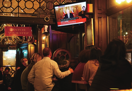 10月31日,英国伦敦一家酒吧内,人们收看英国首相约翰逊宣布“禁足”措施的新闻。图片来源 新华社