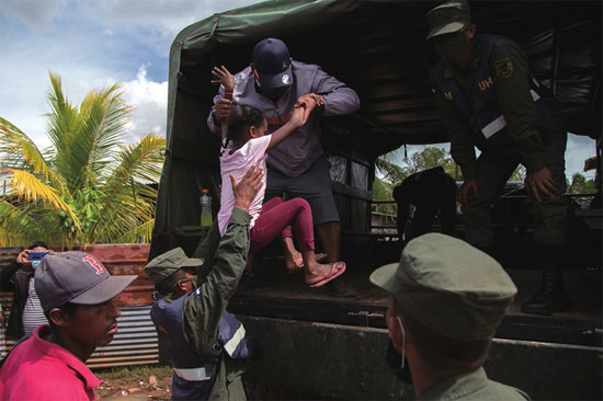 11月15日,尼加拉瓜莫斯基托斯海岸北部卡贝萨斯港,军队协助当地居民撤离。热带风暴“艾奥塔”正在向中美洲逼近,威力不断增强。图片来源 视觉中国