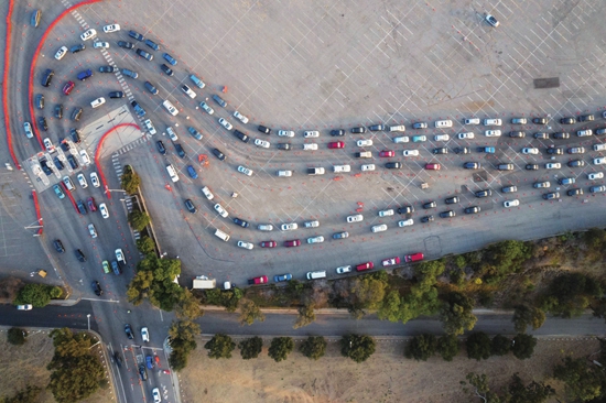 11月23日,美国加利福尼亚州洛杉矶,民众驾车进行新冠病毒检测。当日,加州州长加文·纽瑟姆表示,加州新冠肺炎疫情形势继续恶化,两周以来,该州感染人数激增77%,重症监护病房人数激增55%。
