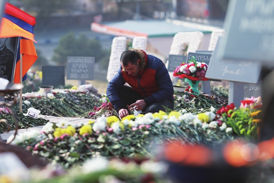 在亚美尼亚首都埃里温的公墓,当地人安葬在纳卡冲突中阵亡的士兵。图片来源 新华社