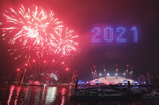 英国伦敦跨年夜上演灯光秀,烟花和无人机照亮了夜空。由于新冠肺炎疫情,伦敦往年的大型跨年烟花秀被取消。图片来源 视觉中国
