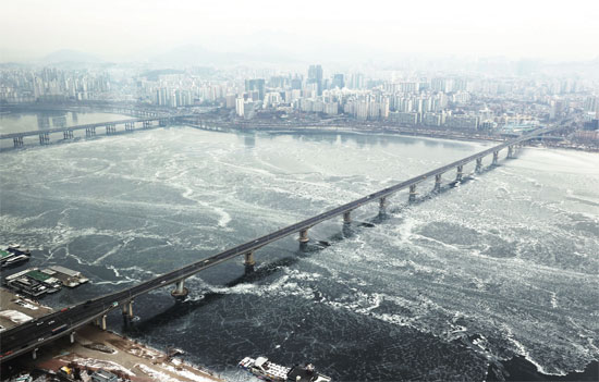 1月10日,韩国首尔持续低温,汉江今冬首次结冰。图片来源 视觉中国