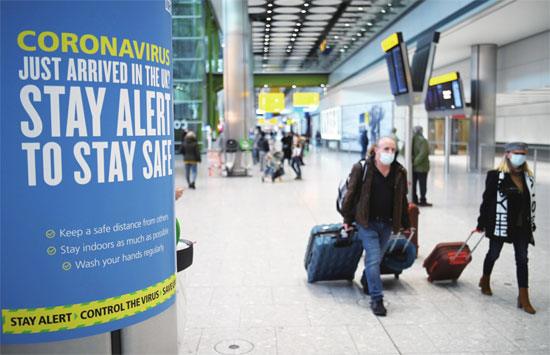 1月15日,英国希思罗机场里的旅客。特朗普1月18日发布行政令,要求从1月26日起解除对欧洲大部分地区和巴西的旅行限制。拜登政府的白宫新闻秘书詹·普萨基表示,随着新冠肺炎疫情的恶化,取消国际旅行限制的时机尚未到来,拜登政府不打算解除这些限制,计划进一步加强有关国际旅行的公共卫生措施。图片来源 视觉中国